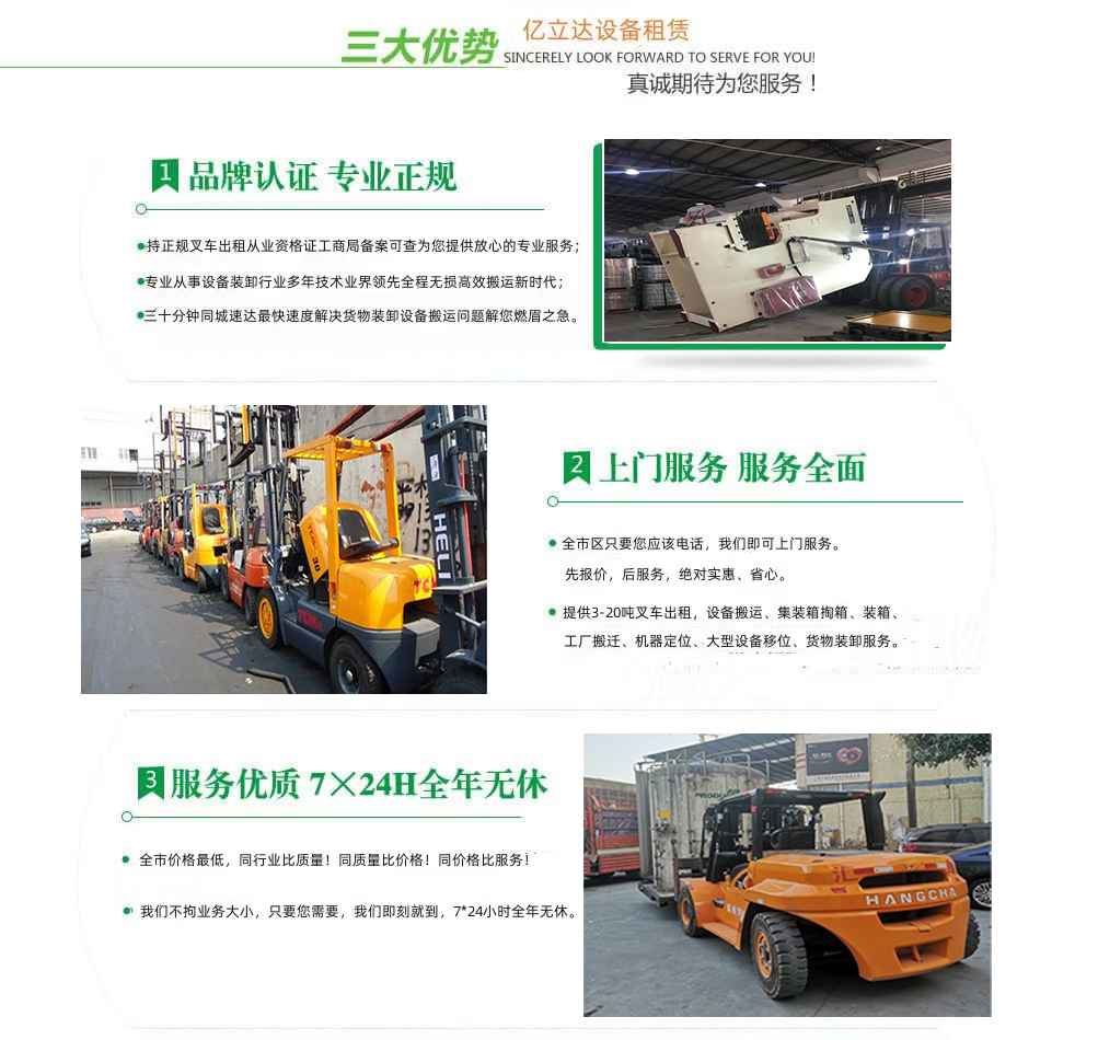 亿立达设备租赁有限公司是工商局准许的北京艺术传媒职业学院专业叉车出租公司,公司本着诚信、服务、效率、创新的经营理念,用精湛的技术,真诚的服务,为众多客户提供优质的服务,同时获得信赖与支持。专业提供北京艺术传媒职业学院3-20吨叉车出租、叉车租赁、设备搬运、集装箱掏箱装箱、机器移位定位、货物装卸、工厂搬迁、安全可靠,收费透明,价格便宜,随叫随到,24小时上门服务!本公司叉车吊车师傅对各种设备搬运装卸都有深刻探讨和研究。很多的疑难设备搬运,通过我公司的叉车师傅都能迎刃而解。对各种进口设备、国产机器、大型设备搬迁、高难度搬迁、各种精密仪器、医疗设备、科研设备等都能搬运; 提供全市 24 小时上门装卸搬运服务。同时提供厂房搬迁服务。 ...